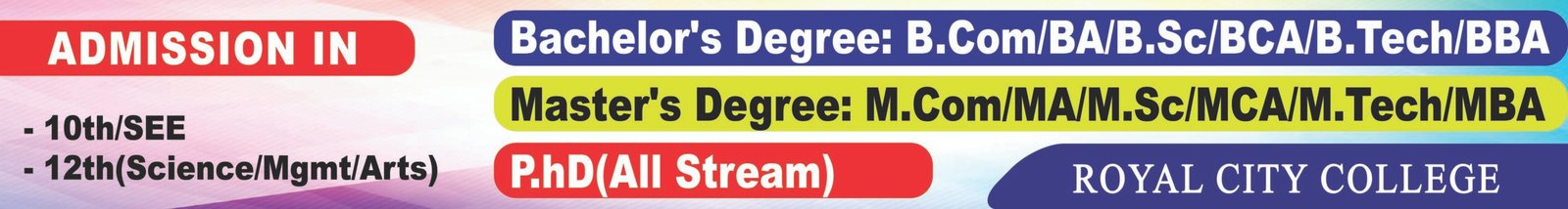 Welcome to Royal City College, established in 2018, offering flexible education in Nepal. With ties to over 50 universities in India, we provide private and online programs to suit your goals. We are dedicated to supporting every student’s journey towards a bright and successful future.